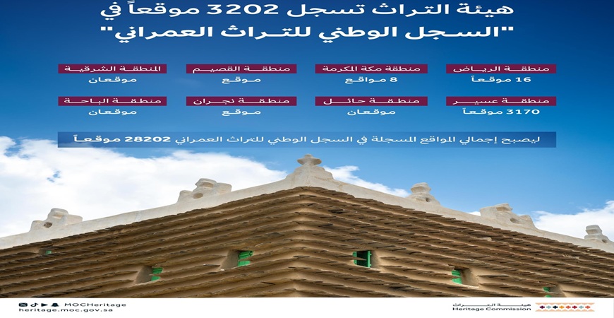 أعلنت هيئة التراث، تسجيل 3202 موقع جديدة ضمن السجل الوطني للتراث العمراني؛ لترتفع حصيلة المواقع المسجلة إلى 28.202 موقعٍ تعكس في مجملها غنى التراث السعودي، وذلك في إطار جهودها نحو توثيق المواقع التراثية وحمايتها .