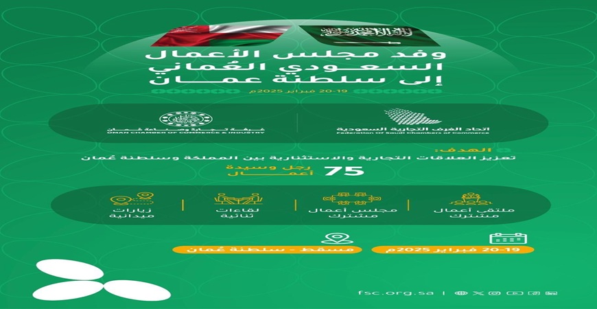 يُنظّم اتحاد الغرف السعودية وغرفة تجارة وصناعة عُمان بالعاصمة العُمانية مسقط، الأربعاء “19 فبراير 2025″، فعاليات ملتقى الأعمال السعودي العُماني المشترك بمشاركة وفدٍ يضم (75) من أصحاب الأعمال السعوديين وممثلي الجهات الحكومية.