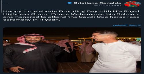 ونشر رونالدو مساء السبت “22 فبراير 2025″، عبر حسابه الرسمي على منصة “إكس” صورة له مع ولي العهد، حيث عبر عن سعادته قائلاً: “يسعدني أن أحتفل بيوم التأسيس مع ولي العهد الأمير محمد بن سلمان، ويشرفني حضور حفل كأس السعودية لسباق الخيل في الرياض”، مرفقًا صورة له وهو يرتدي الثوب السعودي، واقفًا بجانب اسمو ولي العهد.