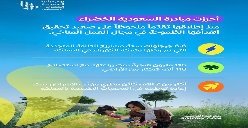 وبمناسبة يوم مبادرة السعودية الخضراء، الذي يتزامن مع ذكرى إطلاق المبادرة في 27 مارس، تحتفي المملكة بالإنجازات المتميزة التي حقّقتها المبادرة لغاية اليوم، مجدّدةً التزامها بحماية البيئة وتعزيز دورها الريادي ضمن الجهود العالمية لمكافحة تداعيات التغير المناخي.
