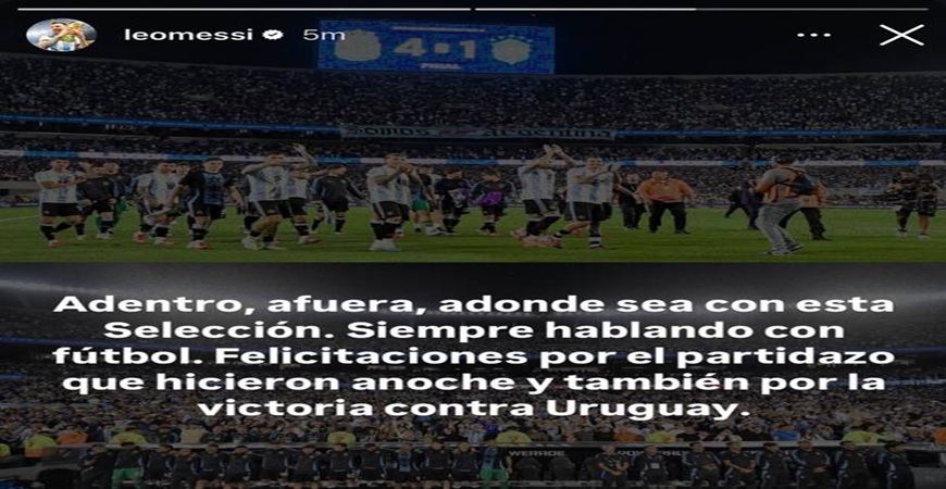 ونشر ميسي، على حسابه بشبكة “إنستجرام، صورة للاعبي الأرجنتين عقب الفوز على البرازيل، بالإضافة إلى نتيجة المباراة، وكتب عليها: “هذا المنتخب الوطني دائمًا ما يتحدث من خلال كرة القدم، سواء كان يلعب في الداخل أو الخارج”.