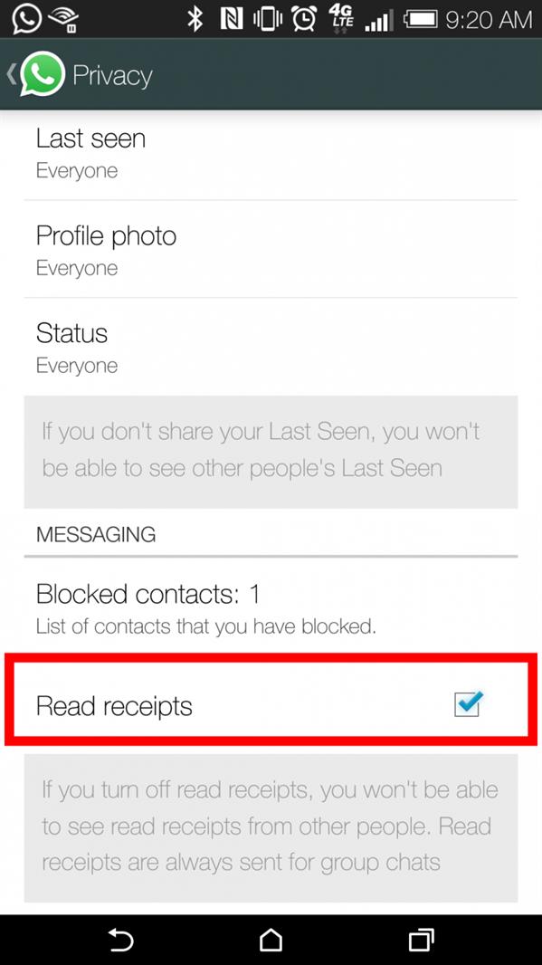 وفي التحديث الجديد ظهر خيار ضمن إعدادات الخصوصية وهو اشعارات القراءة Read Receipts وعند إزالة الإشارة عنها فلن تتمكن من معرفة إن قرأ أصدقائك رسالتك وكذلك لن تتلقى علامتي الصح الزرقاء التي تفيد بأنه قرأ رسالتك أيضاً. لكن هذه الخصوصية لن تطبق على المحادثات الجماعية بل ستقتصر على المحادثات الفردية حالياً حيث سيتمكن دائماً أعضاء المجموعة من معرفة من قام بقراءة الرسائل و توقيت ذلك أيضاً.
