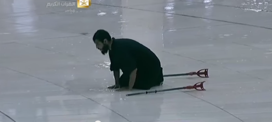 تناقل مستخدمون سعوديون لمواقع التواصل الإجتماعي، مقطع فيديو مؤثر ، يظهر شابا من ذوي الاحتياجات الخاصة وهو يؤدي الصلاة وحيداً تحت المطر في إحدى ساحات المسجد الحرام بمكة المكرمة أمس الأحد.