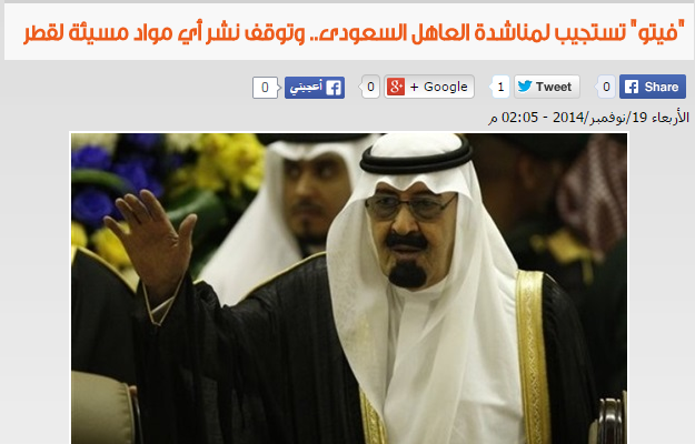 أعلنت صحيفة “فيتو” الإسبوعية المصرية استجابتها لمناشدة خادم الحرمين الشريفين الملك عبدالله بن عبدالعزيز وذلك بامتناعها عن نشر أى مواد مسيئة لقطر.