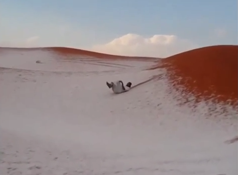 عبر شاب سعودي عن فرحته الغامرة بسقوط الأمطار وحبات البرد فى الصحراء على طريقته الخاصة ، حيث أظهر مقطع فيديو طريف الشاب وهو يتزلج على الرمال التى اكتست باللون الأبيض جراء تساقط حبات البرد عليها .