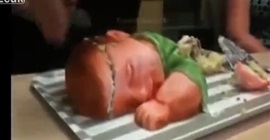 أظهر مقطع فيديو رجلا يقوم بتقطيع قالب كعك (تورتة) على هيئة طفل.