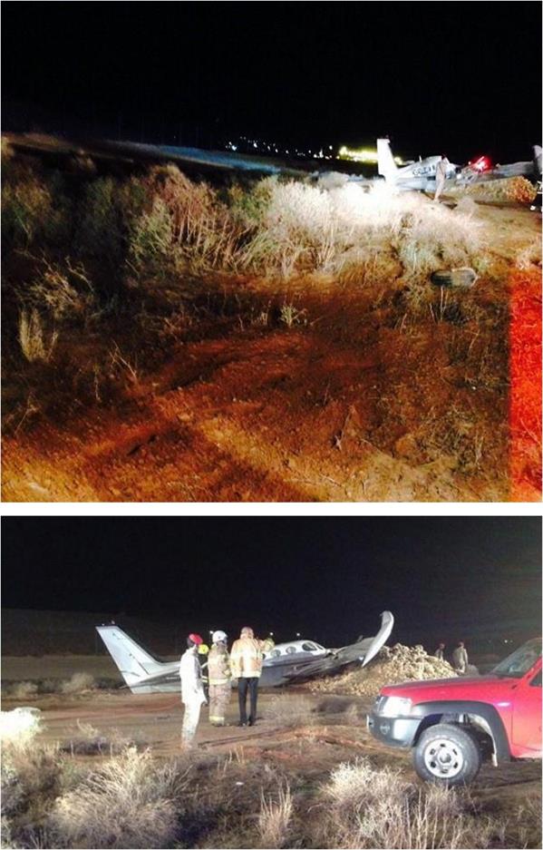 وقال المتحدث الرسمي للهيئة خالد الخيبري إن المصابين جرَّاء الحادث أمريكيان، موضحة أن قائدها أبلغ المراقبة الجوية بالمطار عن نفاد الوقود ورغبته في الهبوط؛ لكنه وقبل الوصول للمطار بنحو ميلين هبطت الطائرة اضطراريًا، وأدى ارتطامها بالأرض إلى إصابة قائدها ومرافقه.