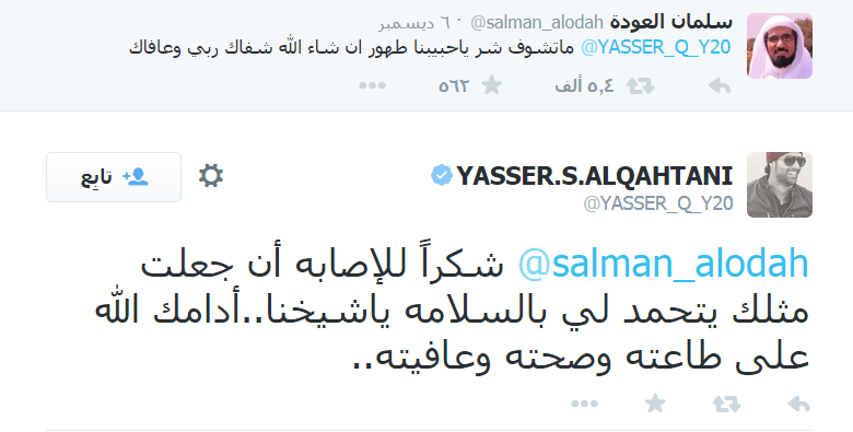 قال الشيخ الدكتور سلمان بن فهد العودة معلقا على تأكيد نجم فريق الهلال اللاعب ياسر القطحاني إصابته بقطع فى الرباط الصليبي :”ماتشوف شر ياحبيبنا طهور إن شاء الله شفاك ربي وعافاك”.