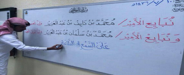 تناقل مغردون سعوديون على موقع التواصل الاجتماعي “تويتر” صورة لمعلم سعودي افتتح أول دروسه لتلاميذه صباح اليوم الأربعاء بكتابة عبارات مبايعة للأمير محمد بن نايف وليا للعهد والأمير محمد بن سلمان وليا لولي العهد.