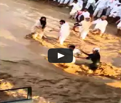 كما أظهر المقطع تجمع عدد كبير من المواطنين على ضفاف وادي الشيق بمحافظة خميس مشيط، فى محاولة لإنقاذ سائق بعد أن جرفت مياه السيل سيارته، حيث نزل إلى مياه السيل عدد من الشباب ملتفين بحبال حول بعضهم؛ في محاولة لاستخراج قائد المركبة ، وهو ما تحقق بالفعل حيث نجحوا فى إنقاذه.