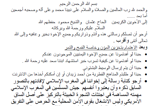 وعرضت المخابارت الأمريكية اليوم الأربعاء لرسائل بن لادن، وهي عبارة عن أكثر من مئة وثيقة، وجهها زعيم تنظيم القاعدة آنذاك إلى من بايعه وإلى شعوب محددة، وتكشف الوثائق عن جزء مهم من أفكار بن لادن وتكتيكاته، وما الذي خطط له أثناء توليه للتنظيم، الذي تراجع كثيراً بعد مقتله، ومن ثم بعد ظهور التنظيم الإرهابي الآخر المسمى بداعش والذي يحتل أجزاء من سوريا والعراق.