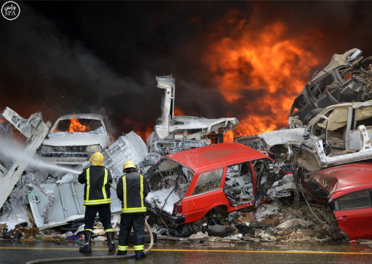 طائرات الدفاع المدني تشارك 24 فرقة في إخماد حريق بمجمع تشليح في بريمان جدة