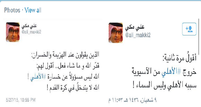 وكان مكي قال فى تغريدات على حسابه بموقع التواصل الاجتماعي “تويتر” : “الله لا يتدخل في الرياضة” ، مضيفا ” أقول مرة ثانية.. خروج الأهلي من الآسيوية سببه الأهلي وليس السماء”.