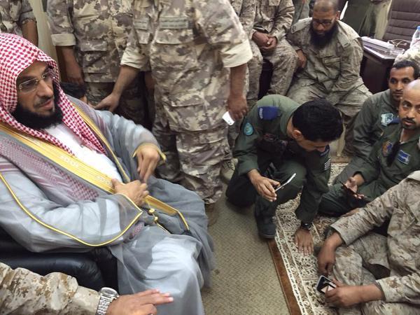 عائض القرني فى طائرة عسكرية للتحالف ويخطب فى الجنود المرابطين على الحدود (صور)