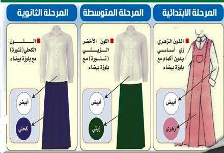 ويتكون الزي الجديد المعتمد للمرحلة الابتدائية، من زي أساسي بدون أكمام باللون الزهري، مع بلوزة بيضاء، وللمرحلة المتوسطة يتكون من “تنورة” باللون الأخضر الزيتي، وبلوزة بيضاء، بينما يتكون زي المرحلة الثانوية من “تنورة” باللون الكحلي، وبلوزة بيضاء.
