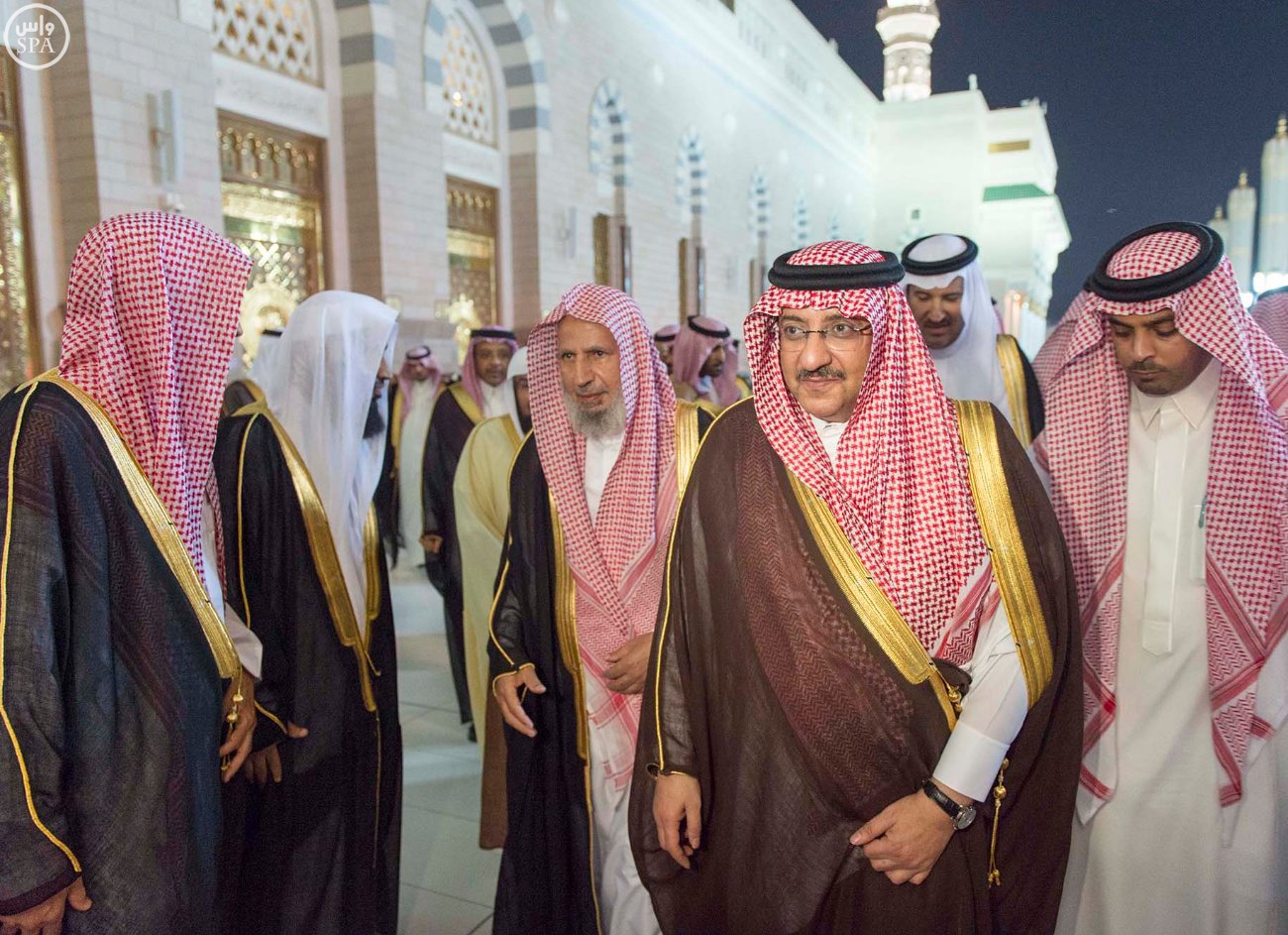 قام صاحب السمو الملكي الأمير محمد بن نايف بن عبد العزيز ولي العهد نائب رئيس مجلس الوزراء وزير الداخلية بزيارة إلى المسجد النبوي حيث أدى ركعتي تحية المسجد في الروضة الشريفة ، ثم تشرّف بالسلام على رسول الله محمد صلى الله عليه وسلم، وعلى صاحبيه رضي الله عنهما.