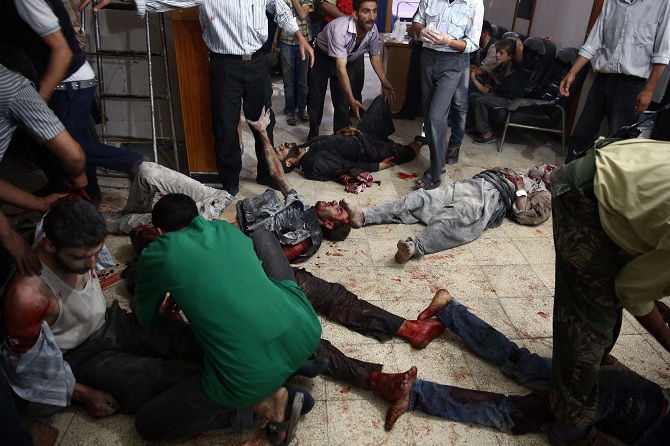 وتظهر صور داخل احد المستشفيات الميدانية طفلا يجلس على كرسي والدماء تسيل من رأسه وتغطي عنقه وقميصه والى جانبه رجل مسن يغطي الغبار وجهه ورأسه مضمد بقطعة قماش بيضاء وكذلك يده.