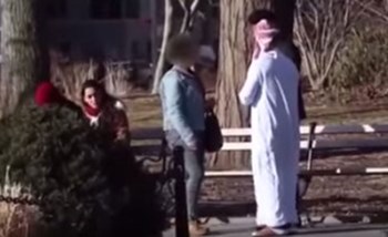 أمريكي يرتدى زي خليجي ويتحرش بفتاة باللغة العربية شاهد ردة فعلها ! (فيديو)