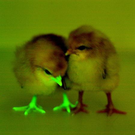 في خضم الابحاث الخاصة بانفلونزا الطيور قد يهز الدجاج المعدل وراثيا وتتوهج خلال الليل مناقيره وأقدامه صناعة الدجاج هزا.