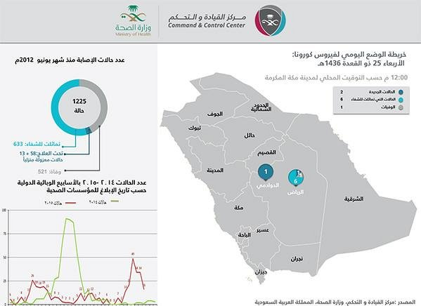 وذكرت الوزارة فى بيان لمركز القيادة والتحكم أن حالة الوفاة كانت لمواطن سعودي في الـ41 من عمره، وأن حالات الإصابة الجديدة كانت لمواطنين اثنين أحدهم في الرياض وحالته حرجة تحت التقصي والآخر في الدوادمي وحالته مستقرة، إضافة إلى تماثل ست حالات للشفاء في الرياض.