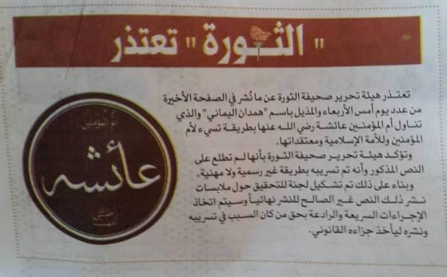 وقالت هيئة تحرير صحيفة الثورة اليمنية الحكومية في اعتذارها بصفحتها الأخيرة من عددها الصادر اليوم الخميس أنها تعتذر عن مانشرته في الصفحة الاخيرة من عدد يوم أمس الأربعاء والمذيل باسم “همدان اليماني” والذي قالت أنه تناول أم المؤمنيين عائشة رضي الله عنها بطريقة تسيء لأم المؤمنيين وللأمة الاسلامية ومعتقداتها.
