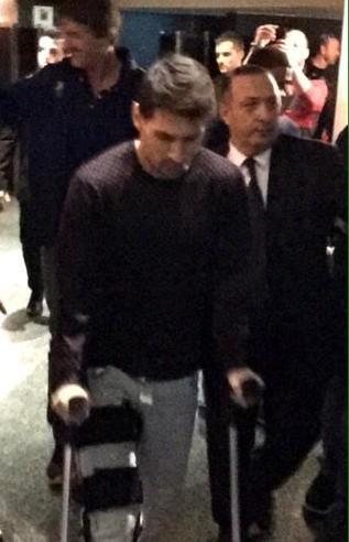 والتقطت عدسات المصورين النجم الأرجنتيني في أثناء دخوله لملعب الكامب نو، مستعيناً بعكازتين مع تثبيت القدم اليمنى التي يُعاني منها اللاعب من إنزعاجات كبيرة.