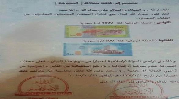 وطلب التنظيم أيضاً، في حملة واسعة على ما يبدو محلات الصرافة، عدم قبول الأوراق المالية الجديدة، والامتناع عن صرفها أو ترويجها في الأراضي الخاضعة له، مهدداً بمعاقبة المخالفين.