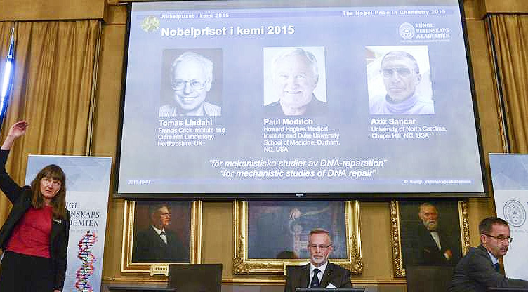 والفائزون الثلاثة هم السويدي توماس ليندال، والأمريكي بول مودريك، والأمريكي من أصل تركي عزيز سنقر، وتركزت الأبحاث التي قاموا بإجرائها على الطريقة التي تقوم فيها الخلايا بإصلاح الأحماض النووية، والحفاظ على المعلومات الجينية.