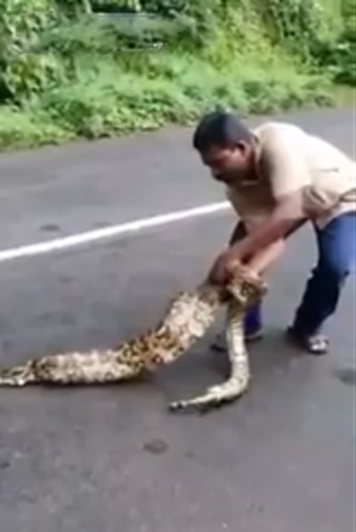 نشر موقع «لايف ليك» فيديو صادما لرجل يمسك بثعبان ضخم ويجبره على تقيؤ حيوانات ابتلعها على الطريق في الهند.