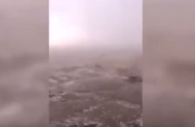 وتظهر في الفيديو أراضي المنطقة وقد غطت الثلوج ملامحها ليحل اللون الأبيض جميع أنحاء المنطقة.