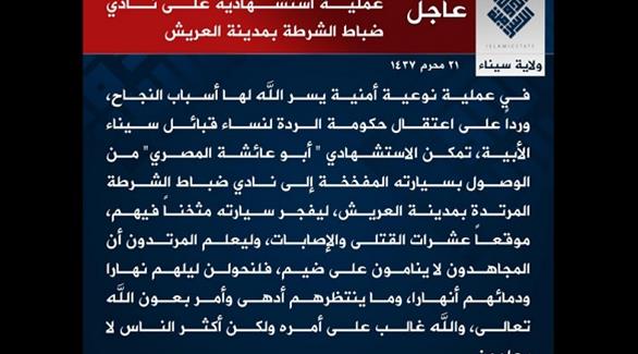 وتبنى “ولاية سيناء” الفرع المصري لتنظيم داعش، والذي يشن اعتداءات وهجمات دامية ضد الشرطة والجيش بشكل شبه يومي، على الفور انفجار العريش على حساباته على تويتر، مؤكداً أن انتحارياً نفذه رداً على اعتقال نساء من البدو في المنطقة.
