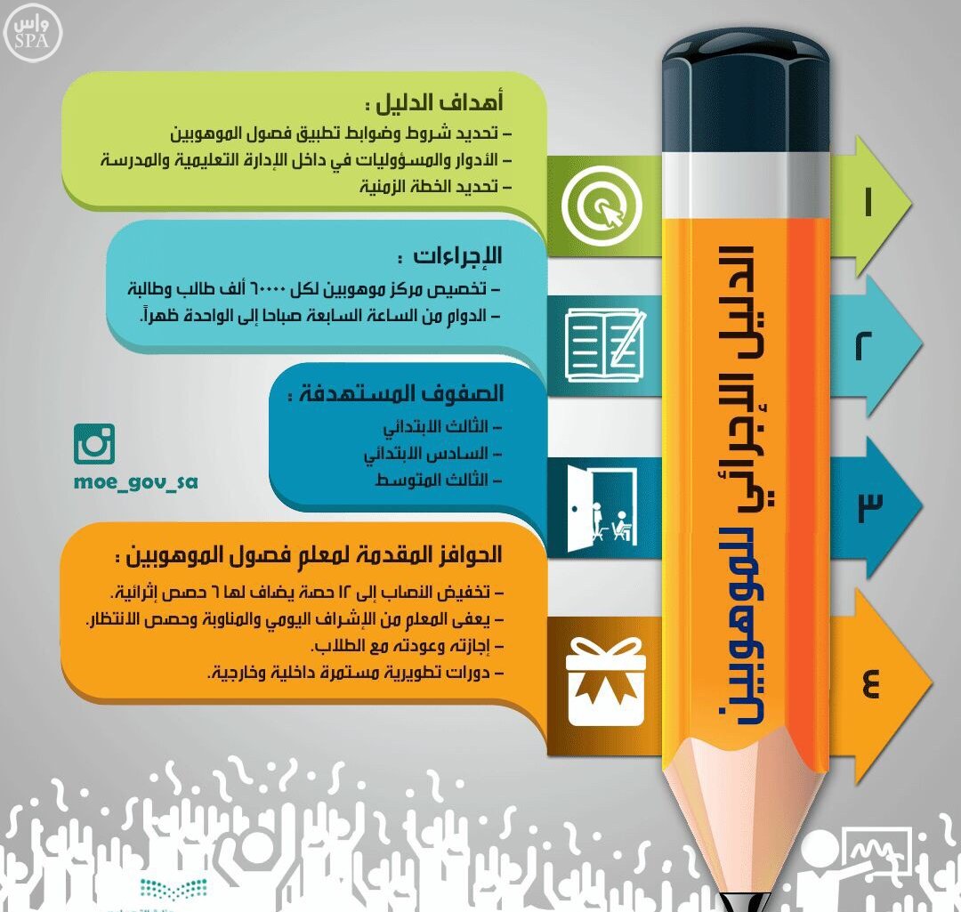 وشملت الإجراءات الجديدة تخصيص مركز موهوبين لكل 60000 ألف طالب وطالبة أي ما يعادل (83) مركزا للموهوبين سيتم سد احتياجها بالتدرج على 3 سنوات بالكوادر والميزانيات, بالإضافة إلى التوسع في عدد معلمي الموهوبين وفقا لضوابط حددتها الوزارة.