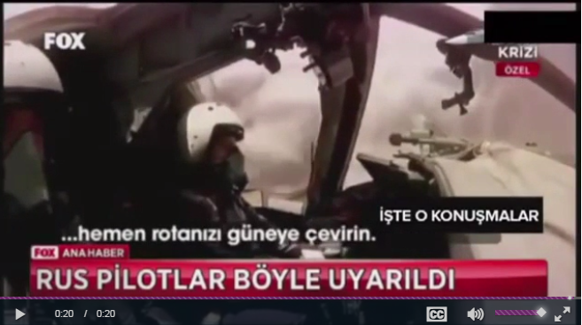 بثت شبكة فوكس بنسختها التركية، تسجيلاً صوتياً قيل إنه لطيار تركي يحذر طائرة السوخوي الروسية قبيل إسقاطها. وسمع الطيار يتحدث بالإنكليزية ويتوجه إلى الطائرة الروسية محذراً بأنها أضحت في المجال الجوي التركي وأن عليها تغيير مسارها.