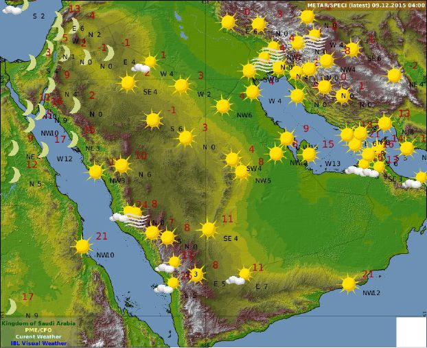 توقّعت الرئاسة العامة للأرصاد وحماية البيئة في تقريرها عن حال الطقس، اليوم، طقساً شديد البرودة خلال الليل والصباح الباكر على مناطق شمال المملكة ووسطها، وتكّون السحب الرعدية الممطرة على مرتفعات مناطق عسير والباحة وجازان تشمل الأجزاء الساحلية الجنوبية لمنطقة مكة المكرمة، مع توقّع رؤية أفقية غير جيدة على منطقة نجران والأجزاء الشرقية لمنطقتي الباحة وعسير.