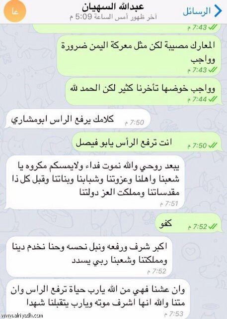 وأردف بالمحادثة ، التي نشرت صحيفة ” الرياض ” نصها : “وإن عشنا فهي من الله، يا رب حياة ترفع الرأس، وإن متنا والله إنها أشرف موتة، ويا رب يتقبلنا شهداء”.