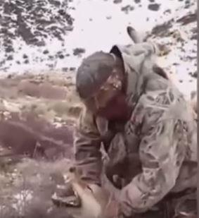 ويظهر الصياد في الفيديو الذي تم تصويره في شرق كازاخستان، وهو يمسك بالذئب من رأسه، محاولاً أن يجبره على التقاط صورة تذكارية برفقته، وقد تلطخ فراء الذئب بالدماء بعد إصابته بعيار نياري قاتل.