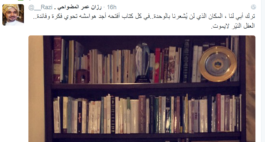 علقت رزان ابنة الصحفى الراحل عمر المضواحي على رحيل والدها بالقول فى تغريدة اطلعت عليها “عناوين” اليوم الجمعة عبر حسابها فى “تويتر” :” ترك أبي لنا ، المكان الذي لن يُشعرنا بالوحدة..في كل كتاب أفتحه أجد هوامشه تحوي فكرة وفائدة..العقل النيّر لايموت. “.
