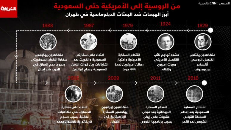 الاعتداءات الإيرانية على البعثات الدبلوماسية في طهران منذ عام 1829 (انفوجراف)