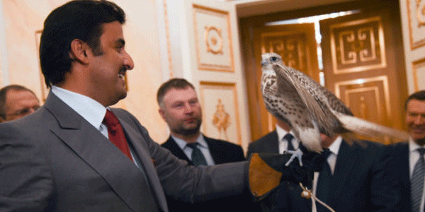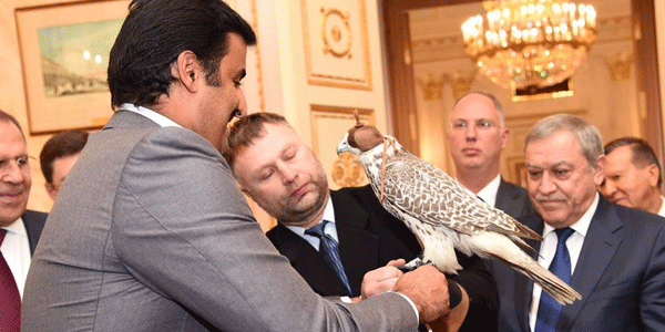 أهدى الرئيس الروسي فلاديمير بوتين، الشيخ تميم بن حمد آل ثاني أمير دولة قطر هدية عبارة عن صقر بمناسبة زيارته لروسيا.