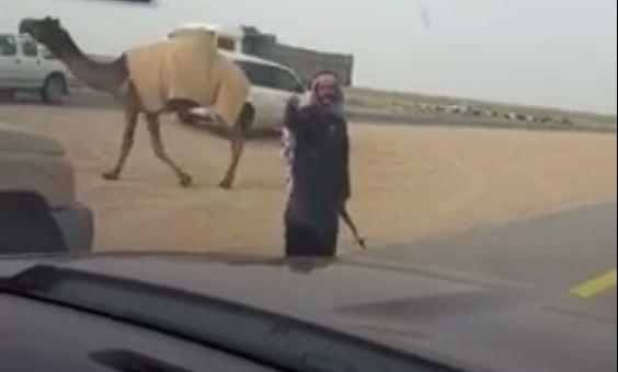 أظهر مقطع فيديو تم تداوله بمواقع التواصل الاجتماعي، مالك إبل يقوم بإيقاف السيارات العابرة لأحد الطرق بالمملكة، قيل أنه طريق حفر الباطن- الكويت، وذلك حتى تعبر إبله الطريق.