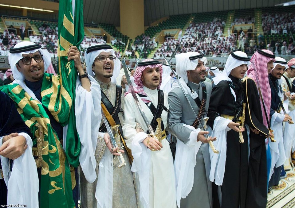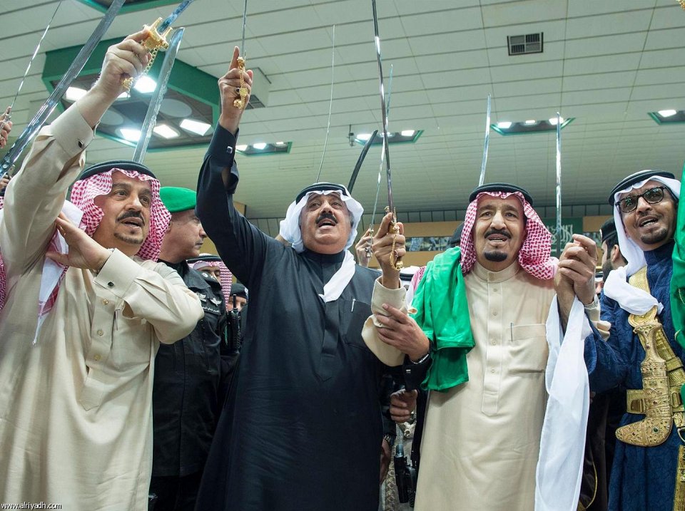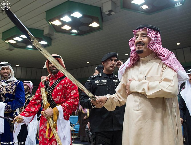 وبعد أن أخذ خادم الحرمين الشريفين الملك سلمان بن عبدالعزيز آل سعود مكانه في المنصة الرئيسة للاحتفال بدأت العرضة السعودية.