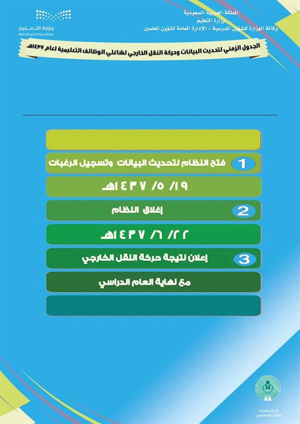 ووفقاً للإدارة العامة لشؤون المعلمين بالوزارة،فإن بداية إدخال رغبات النقل وتحديث وإدخال البيانات لطالبي النقل وجميع شاغلي الوظائف التعليمي سيكون ابتداءً من يوم الأحد 19جمادى الأولى.