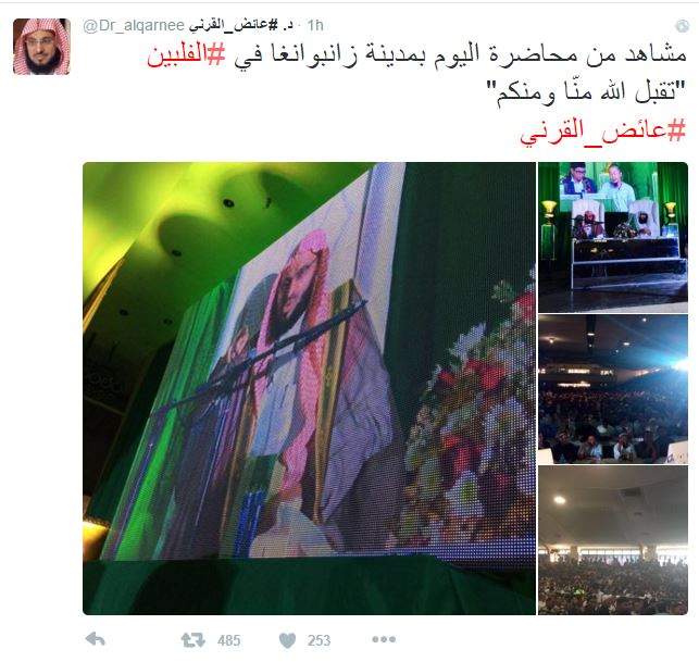 ونشر القرني عدة صور لمحاضرته فى الفلبين وعلق بالقول فى تغريدة اخرى اطلعت عليها “عناوين” : “مشاهد من محاضرة اليوم بمدينة زانبوانغا في #الفلبين”تقبل الله منّا ومنكم”.