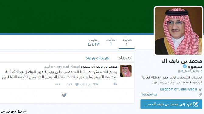 دشن صاحب السمو الملكي الأمير محمد بن نايف ولي العهد نائب رئيس مجلس الوزراء وزير الداخلية، حسابه الشخصي على على موقع التواصل الاجتماعي “تويتر” تحت معرف( @M_Naif_Alsaud).