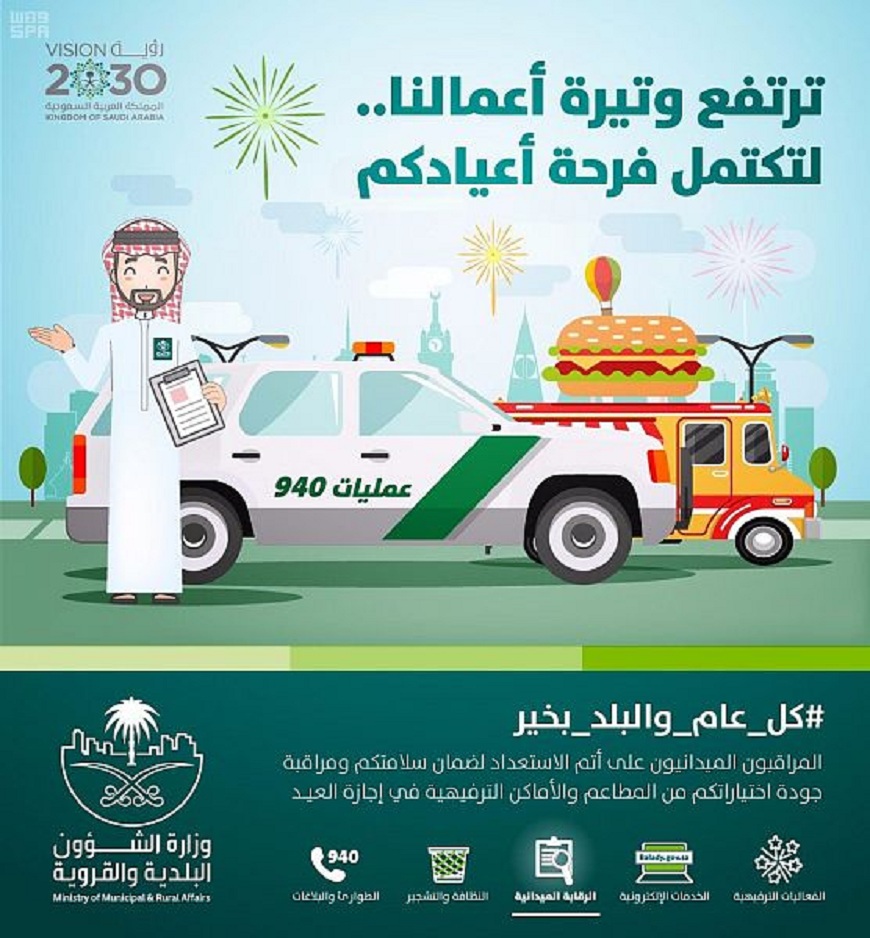 وعلى صعيدٍ ذي صلة سخرت الوزارة بالتعاون مع الأمانات وحدات للنظافة العامة، و12 ألف معدة وألية نظافة لتجوب الشوارع في مختلف مناطق المملكة ومحافظاتها، أثناء إجازة عيد الفطر المبارك، يعمل بها آلاف عمّال النظافة، مبينةً أن المراقبين الميدانيين يعملون طوال 24 ساعة، لضمان سلامة المواطنين والمقيمين، ومراقبة جودة اختيارهم من المطاعم والأماكن الترفيهية.