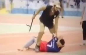 بالفيديو .. رجل أمن يضرب مشجعاً هلالياً بقسوة بعد طرحه أرضاً قبل مباراة الهلال والسد