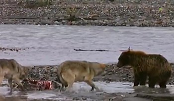 صراع دب مع عدة ذئاب على فريسة ينتهي بتناولهم الطعام سوياً (فيديو)