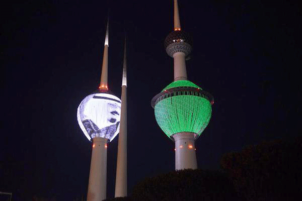 أبراج الكويت تكتسي بصورتين للملك عبدالله وعلم السعودية