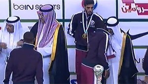شاهد.. لاعب المنتخب القطري يرقص ويتمايل على منصة التتويج