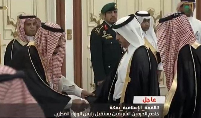 شاهد.. لحظة استقبال خادم الحرمين لرئيس وزراء قطر بالقمة الإسلامية
